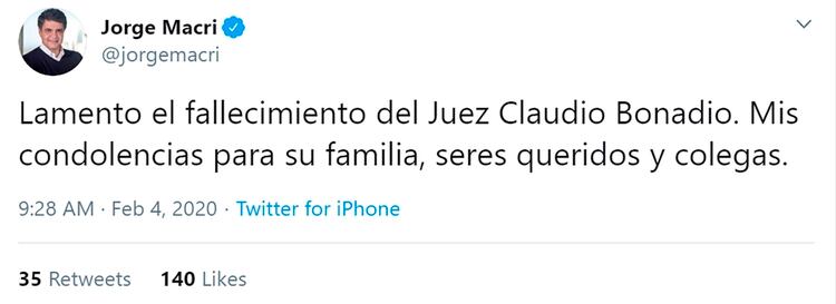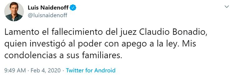 Por su lado, Luis Naidenoff, titular del interbloque opositor en el Senado, resaltó que Bonadio “investigó al poder con apego a la ley”.