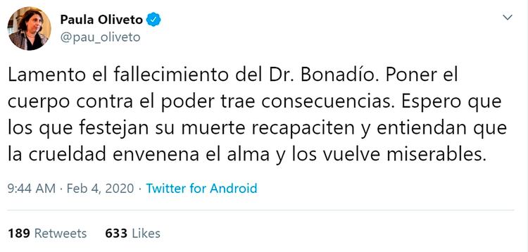 La diputada Graciela Ocaña fue, quizás, la dirigente que primero se manifestó en las redes y -luego- en declaraciones radiales reconoció que la noticia le daba “mucha tristeza” porque se trataba de “un hombre joven que trabajaba mucho por la justicia”. Dijo también que “nadie esperaba este desenlace” y que “era reacio a hablar de su salud”.