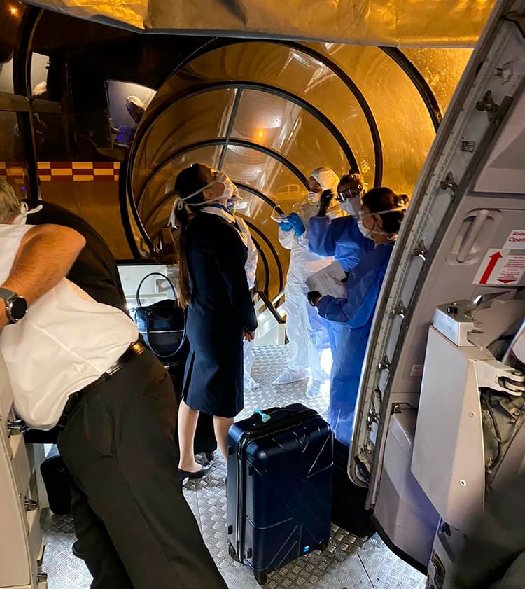 Fuentes del aeropuerto consultadas por Infobae precisaron que “el vuelo fue llevado a una posición remota e intervino sanidad de frontera porque supuestamente tres tripulantes con fiebre pero al final no pasó nada, al rato liberaron a todos”.