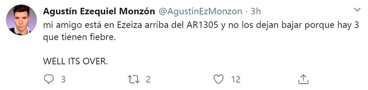 “Mi amigo está en Ezeiza arriba del AR1305 y no los dejan bajar porque hay 3 que tienen fiebre”, contó Agustín Ezequiel Monzón en Twitter.