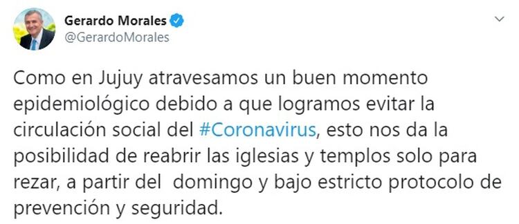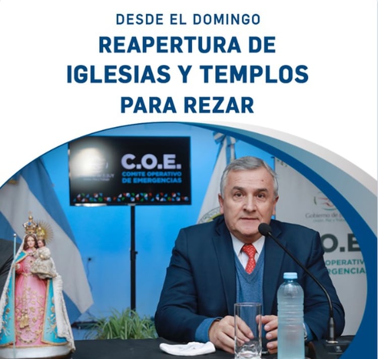 La medida fue confirmada a través de las redes sociales por el gobernador Gerardo Morales, quien destacó que la provincia atraviesa “un buen momento epidemiológico debido a que logramos evitar la circulación social del coronavirus”. “Esto nos da la posibilidad de reabrir las iglesias y templos solo para rezar, a partir del domingo y bajo estricto protocolo de prevención y seguridad”, anunció.