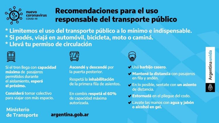 La cartera que dirige Claudio Moroni insistió en la recomendación de reducir al mínimo indispensable el uso de colectivos y trenes urbanos, los cuales deben ser utilizados para el traslado de trabajadores esenciales o con habilitación de circulación correspondiente, únicamente en caso de no poder trasladarse en automóvil, moto, bicicleta o caminando.